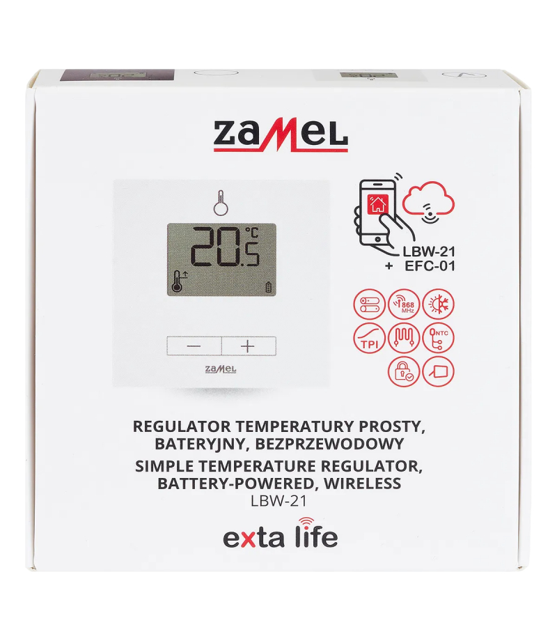 LBW-21 to nowoczesny regulator temperatury, który działa na baterie i komunikuje się bezprzewodowo dzięki technologii EXTA LIFE. Jego kompaktowa konstrukcja pozwala na montaż na ścianie lub postawienie w dowolnym miejscu, co zapewnia maksymalną wygodę użytkowania.