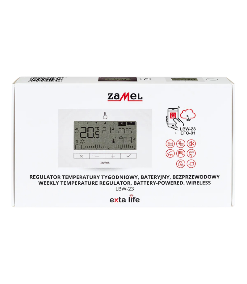 Zadaniem regulatora jest utrzymywanie komfortu cieplnego w pomieszczeniu w oparciu o harmonogram tygodniowy i cztery zdefiniowane temperatury. LBW-23 łączy się bezprzewodowo z listwą ogrzewania podłogowego LLM-21 lub odbiornikiem LOT-21. Współpracuje z wybranymi odbiornikami systemu EXTA LIFE. Możliwa jest konfiguracja i sterowanie poprzez aplikację Exta Life (współpraca z EFC-01).