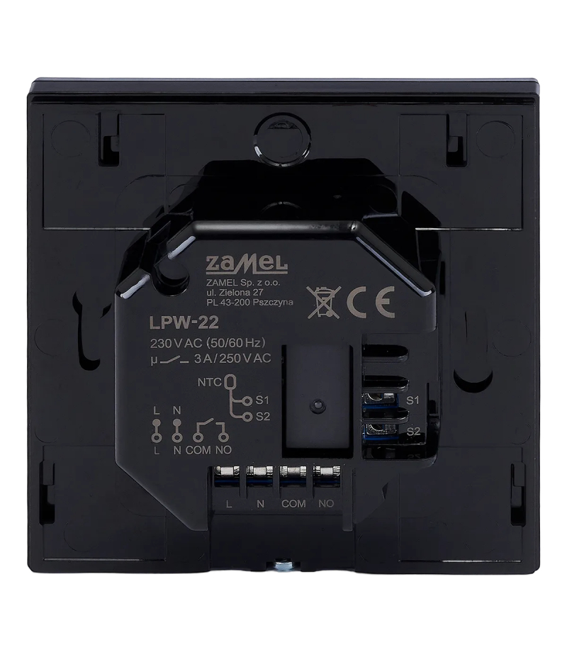 Regulator zasilany napięciem 230 V~ przeznaczony do montażu podtynkowego w puszkach Ø60. Zadaniem regulatora jest utrzymywanie komfortu cieplnego w pomieszczeniu