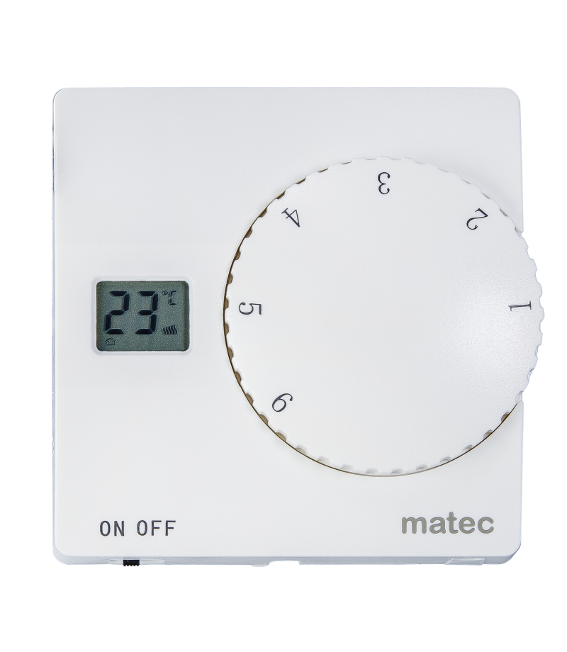 Manualny, natynkowy regulator temperatury. Kontroluje temperaturę za pomocą wbudowanego czujnika wewnętrznego lub podłogowego zewnętrznego. Montaż na ścianie. Możliwość montażu na puszce Ø60. Stosowany do ręcznego sterowania oraz kontroli temperatury w pomieszczeniu. Współpracuje z elektrycznym lub wodnym ogrzewaniem podłogowym.